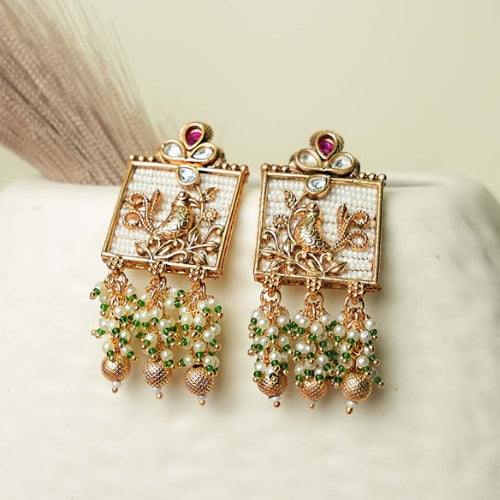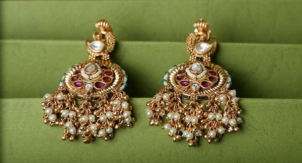 Royal Peacock Antique Jhumkas with Ruby Kundan & Pearl Tassels