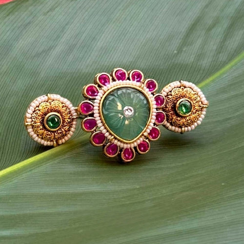 Antique Kundan Dome Jhumkas with Pearl & Green Bead Detailing